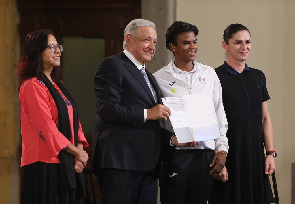 El Presidente de la República Andrés Manuel López Obrador, en compañía de Ana Gabriela Guevara, Directora General de la Comisión Nacional de Cultura, Física y Deporte, CONADE, otorgaron reconocimientos y galardones financieros a los atletas que asistieron a los Juegos Centroamericanos y del Caribe San Salvador 2023, en los cuales la Delegación Mexicana quedó Campeona en el primer lugar del medallero.